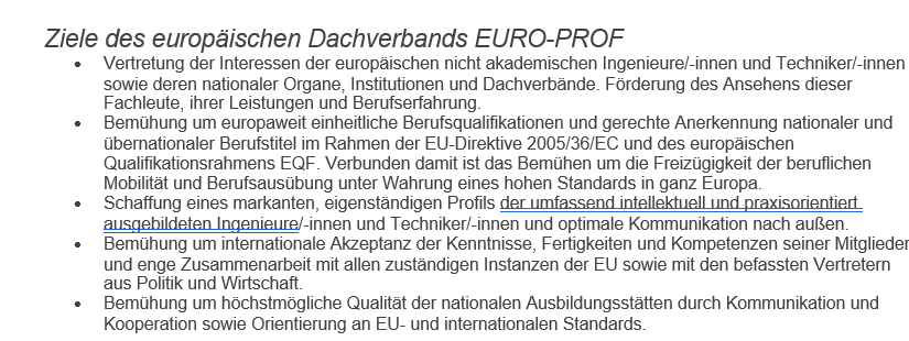 Der Dachverband EURO-PROF bezweckt in erster Linie die Vertretung der Interessen der Bildungsanbieter also Fachakademien sowie deren Verbände im Bereich der höchst qualifizierten nicht-akademischen Berufe insbesondere durch Förderung der beruflichen höheren Aus- und Weiterbildung und internationale Anerkennung der Berufsqualifikationen. Der Verband vertritt sämtliche höher qualifizierte Berufe insbesondere in den Bereichen Technik, Betriebswirtschaft, Gesundheit und Soziales. Er versteht sich als Europäische Dachorganisation der nationalen Berufsverbände und der Bildungsanbieter, in enger Kooperation mit den nationalen und Europäischen Behörden und Organisationen, mit nationalen und internationalen Institutionen, mit Regierungen und weiteren Partnern im Ausbildungsbereich.